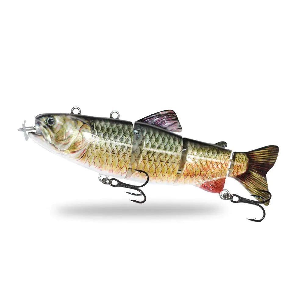 [【USB Rechargeable Fishing Lure】After charging for 2~3 hours Robotic Swimming Lure can work intelligently for 0.5~1 hour. It uses a USB charging interface which is very convenient for charging and can solve the problem of long charging time. Anticreep proprietary technology protects the charging unit and battery from salt water exposure and corrosion. 【4-Segement Robotic Lure】 With multi-section body design the robotic swimming lure can swim flexible and with the propeller-driven programmed electric board and powerful motor it swims more like the real fish. The different sections of the fishing lure body are connected by metal and can withstand the strong bite force. 【Auto Swimming Fishing Lure】 Robotic Swimming Lure uses a simulated fish swimming programming system and lighting design with a high speed motor and LED lighting. You can catch more fish with super-real strokes and lighting temptations day and night. 【Robotic Swimming Fishing Lure】 It is used with floats and front wires to keep Atuo-Swimming Lure swimming in the water which solves the problem that original fishing lure is easily entangled by underwater debris. Use different lengths of front wires at different water depths to keep the water of Atuo-Swimming Lure in your control. 【Package included 】 1xRobotic Swimming Lure with treble hooks 1xUSB Cable 1xFloat 2xSpare Propeller 4x Leader Line 1xInstruction 1xBox. //PS:If you have any problem when you use our productfeel free to let us know. We will help you figure it out.]